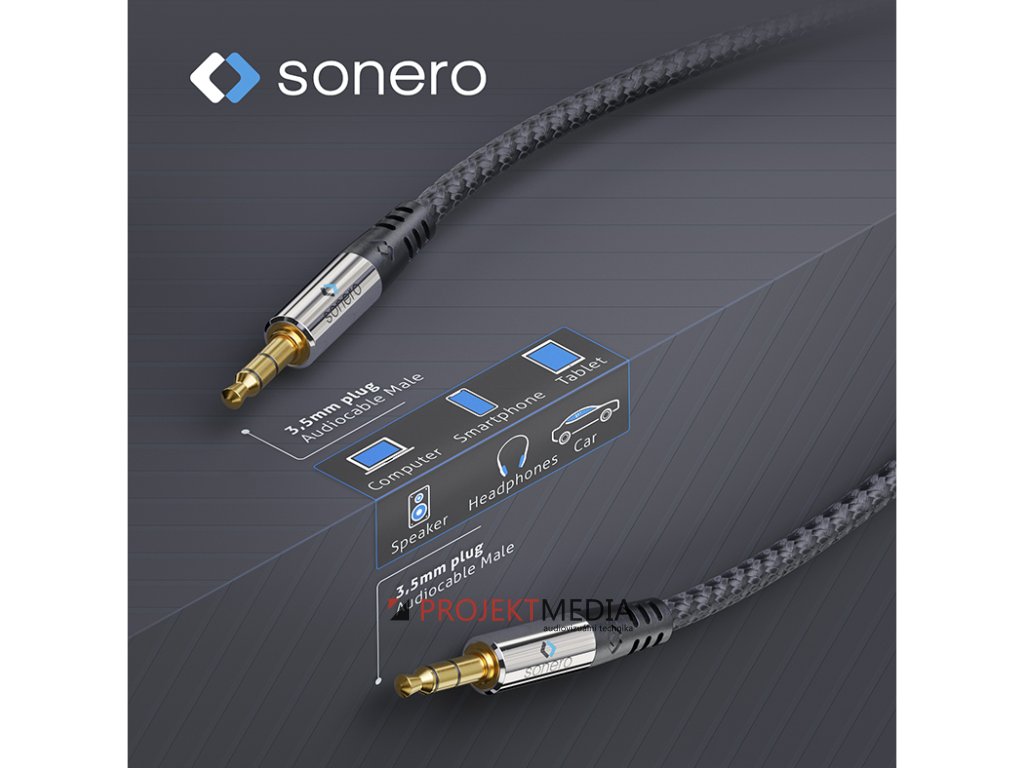 Sonero S-AC505 je 3.5mm jack stereo audio kabel s rovnými konektory a nylonovým povrchem, výrobce: Sonero, model: S-AC505