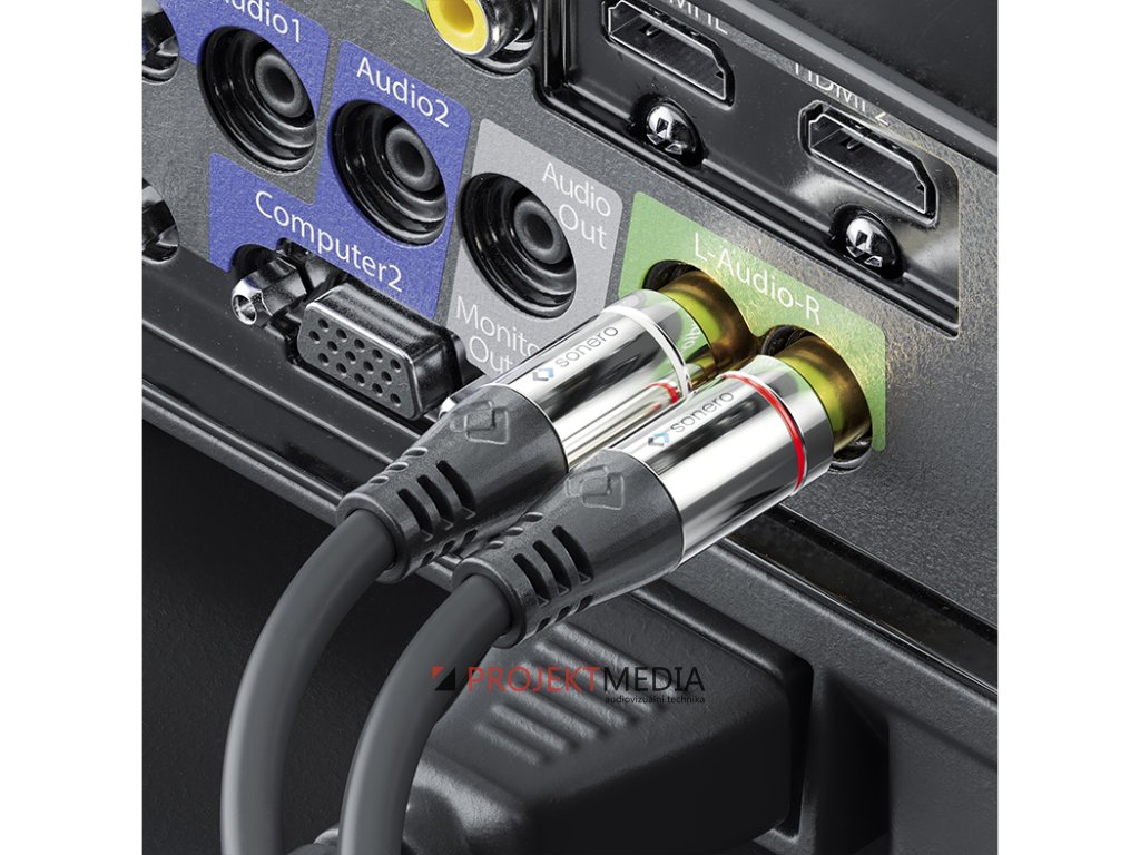 S-AC600 je prémiový audio kabel pro přenos analogových stereo audio signálu přes 3.5 mm jack a duální L/R RCA. Kabel je vybaven pozlacenými kontakty, pochromovanými hliníkovými konektory stejně jako flexibilní ohyb a rovný 3.5mm jack konektor na jedné straně a duální rovné RCA konektory (samec) na druhé straně. Měděné kontakty jsou dvojitě stíněné a mají PVC povrch s vnějším průměrem 4 mm. Tento audio kabel značky Sonero umožňuje spolehlivou a odolnou kvalitu přenosu s ochranou proti korozi.