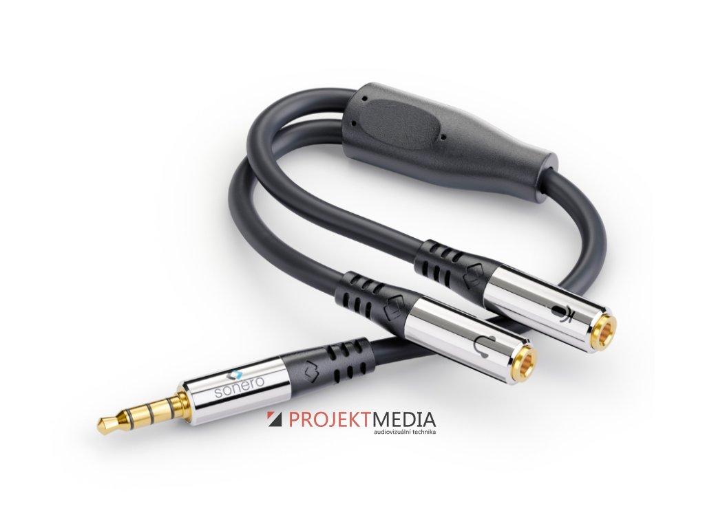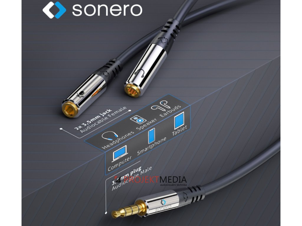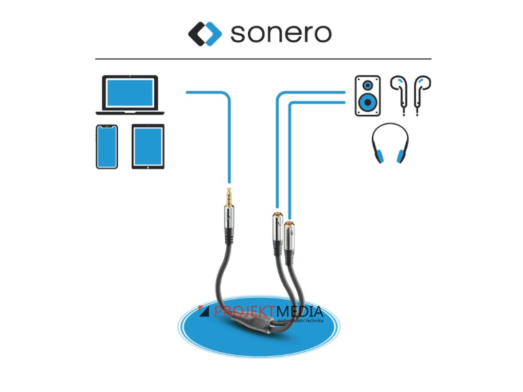 Sonero S-ACA001 je prémiový stereo audio adaptér 3,5 mm samec na 2× 3,5 mm samice, délka 0,2 m, výrobce: Sonero, model: S-ACA001