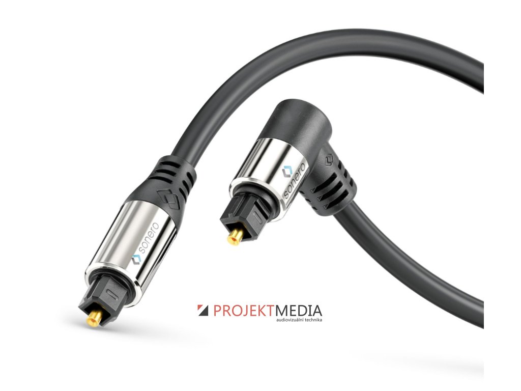 S-OC110-050 prémiový optický audio kabel Toslink s přímým a 90° úhlovým konektorem pro spolehlivý přenos digitálního S/PDIF signálu. Vhodný pro propojení TV, soundbarů, herních konzolí a AV receiverů. Délka: 5 m, výrobce: Sonero, model: S-OC110-050