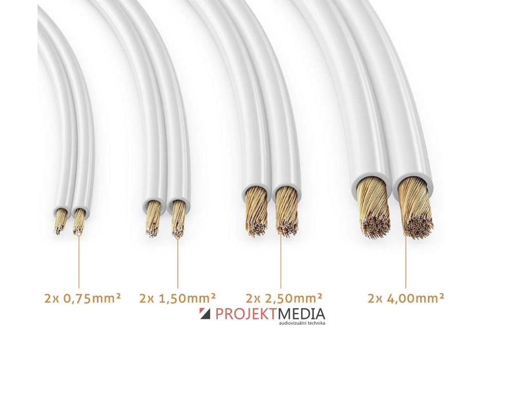 Klíčové vlastnosti:Průřez vodiče: 2× 2,50 mm², materiál CCABílý plášť s černým pruhem – označení polarityFlexibilní a odolný proti zlomení – jemně stočené vodičeVhodný pro Hi-Fi, domácí kino, auto audio, ozvučování akcíVolné konce – možnost vlastního zakončení konektory