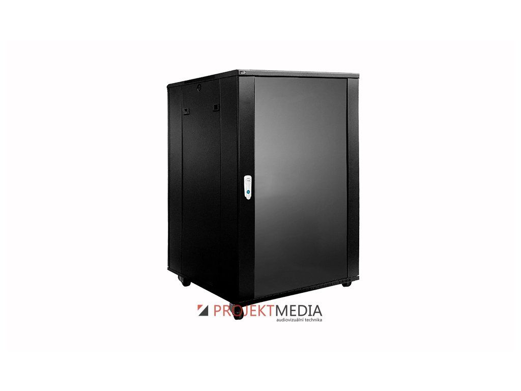 Rozvaděč 19" 18U dle ANSI/EIA RS-310D, DIN41491 a IEC60297, 600x600mm (ŠxH), barva černá RAL9004. Přední dveře s temperovaným sklem, přední i zadní dveře se zámkem a zavěšením na pantech s možností změny orientace, odnímatelné bočnice pro snadný přístup ze strany. Hloubkově posuvné přední i zadní 19" profily s číslováním pozic pro rychlou orientaci, nastavitelná vzdálenost až 540mm. Pevná svařovaná konstrukce ze za studena válcované oceli tl. 2mm (rám) / 1,2mm (plechy), max. zatížení 800kg stat. (na nohách) / 400kg dyn. (na kolečkách). Dodávka v kompletně sestaveném stavu, součástí dodávky 50mm transportní kolečka, stavitelné nohy a sada montážního materálu pro 19" zařízení.
