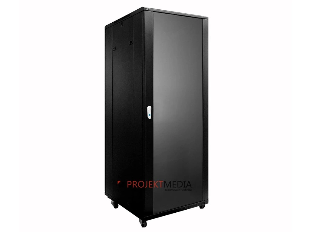Rozvaděč 19" 32U dle ANSI/EIA RS-310D, DIN41491 a IEC60297, 600x600mm (ŠxH), barva černá RAL9004. Přední dveře s temperovaným sklem, přední i zadní dveře se zámkem a zavěšením na pantech s možností změny orientace, odnímatelné bočnice pro snadný přístup ze strany. Hloubkově posuvné přední i zadní 19" profily s číslováním pozic pro rychlou orientaci, nastavitelná vzdálenost až 540mm. Pevná svařovaná konstrukce ze za studena válcované oceli tl. 2mm (rám) / 1,2mm (plechy), max. zatížení 800kg stat. (na nohách) / 400kg dyn. (na kolečkách). Dodávka v kompletně sestaveném stavu, součástí dodávky 50mm transportní kolečka, stavitelné nohy a sada montážního materálu pro 19" zařízení.