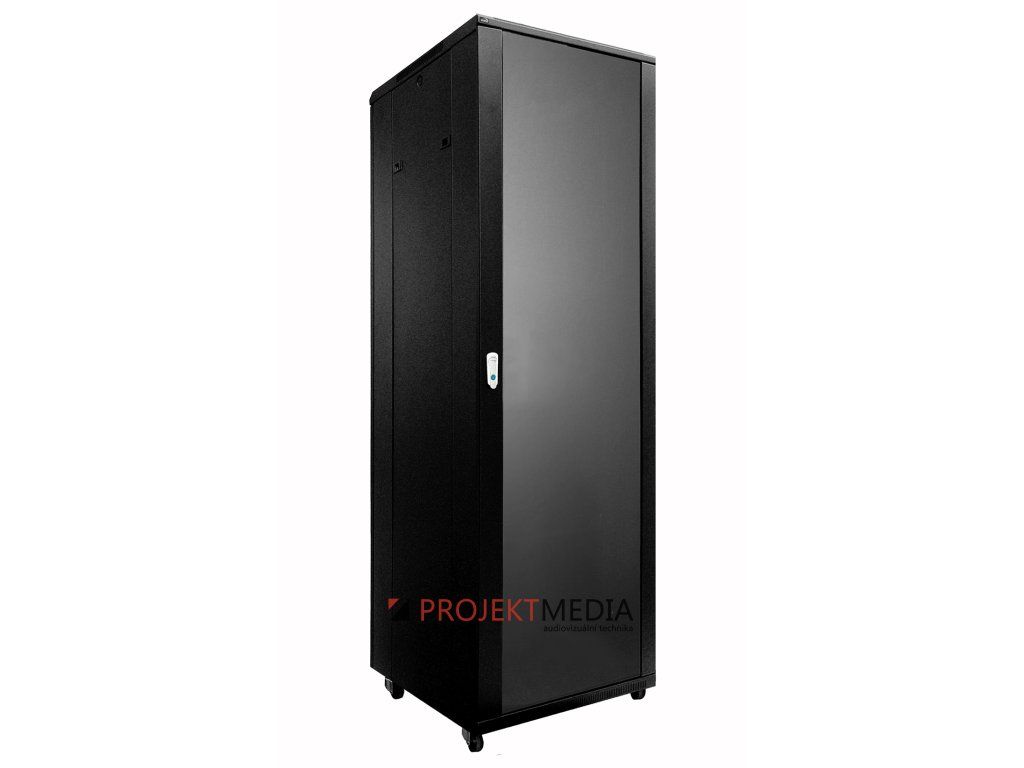 Rozvaděč 19" 42U dle ANSI/EIA RS-310D, DIN41491 a IEC60297, 600x600mm (ŠxH), barva černá RAL9004. Přední dveře s temperovaným sklem, přední i zadní dveře se zámkem a zavěšením na pantech s možností změny orientace, odnímatelné bočnice pro snadný přístup ze strany. Hloubkově posuvné přední i zadní 19" profily s číslováním pozic pro rychlou orientaci, nastavitelná vzdálenost až 540mm. Pevná svařovaná konstrukce ze za studena válcované oceli tl. 2mm (rám) / 1,2mm (plechy), max. zatížení 800kg stat. (na nohách) / 400kg dyn. (na kolečkách). Dodávka v kompletně sestaveném stavu, součástí dodávky 50mm transportní kolečka, stavitelné nohy a sada montážního materálu pro 19" zařízení.