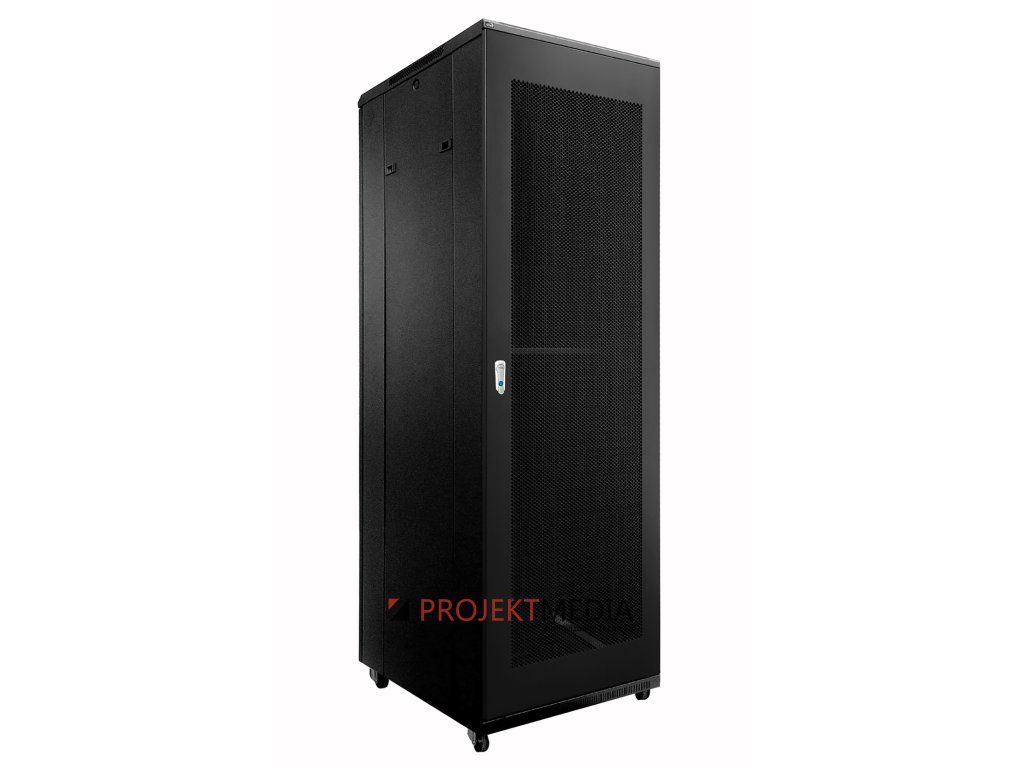 Rozvaděč 19" 42U dle ANSI/EIA RS-310D, DIN41491 a IEC60297, 600x800mm (ŠxH), barva černá RAL9004. Přední i zadní dveře z ocelového plechu s hexagonální perforací pro maximální pasivní ventilaci, se zámkem a zavěšením na pantech s možností změny orientace, odnímatelné bočnice pro snadný přístup ze strany. Hloubkově posuvné přední i zadní 19" profily s číslováním pozic pro rychlou orientaci, nastavitelná vzdálenost až 740mm. Pevná svařovaná konstrukce ze za studena válcované oceli tl. 2mm (rám) / 1,2mm (plechy), max. zatížení 800kg stat. (na nohách) / 400kg dyn. (na kolečkách). Dodávka v kompletně sestaveném stavu, součástí dodávky 50mm transportní kolečka, stavitelné nohy a sada montážního materálu pro 19" zařízení.