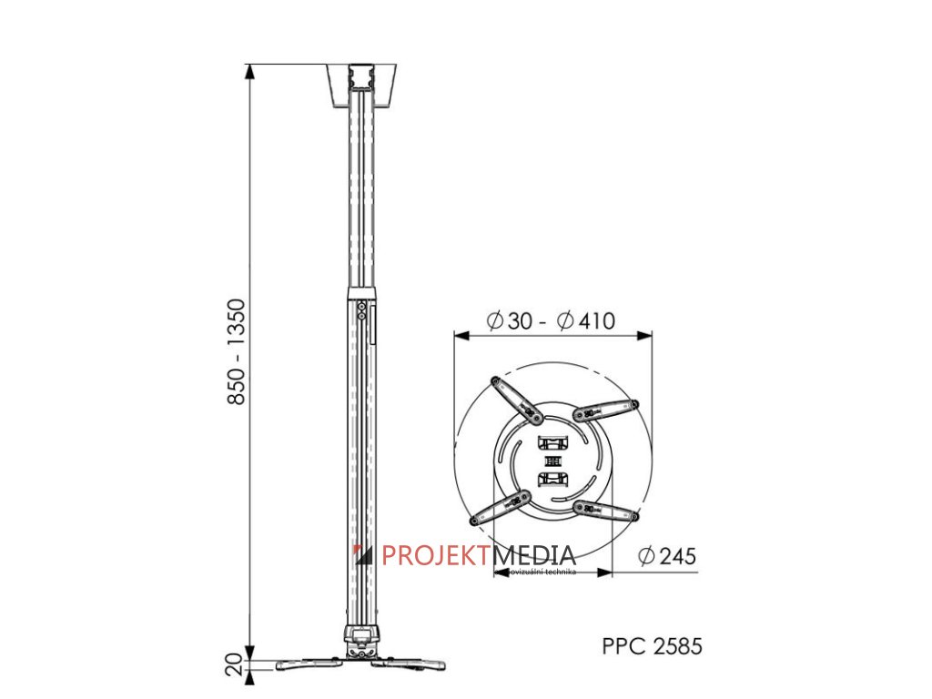 PPC 2585 Professional Teleskopický stropní držák na velký projektor 85-135 cm Teleskopický stropní držák na projektor do 30 kg *ideální pro montáže, kde není přesně známa výška stropu *nastavitelná výška 85-135 cm *určen pro střední a velké projektory do 30 kg *4 nastavitelná montážní ramena s dosahem 30-4107 mm *možnost náklonu a natočení zabezpečí optimální promítací úhel *jemné nastavení podélného a příčného náklonu *aretace ve všech osách zajistí mimořádnou stabilitu, utahovací hlava pro odstranění případné vůle v uchycení *speciální bezpečnostní šrouby *2 kanály na vedení kabelů po celé délce držáku, kabely mohou být vloženy až po instalaci držáku, kapacita až 8 kabelů o průměru 7 mm *stropní úchyt pro vodorovné i šikmé stropy *rychlá a snadná instalace *k dispozici ve stříbrné barvě