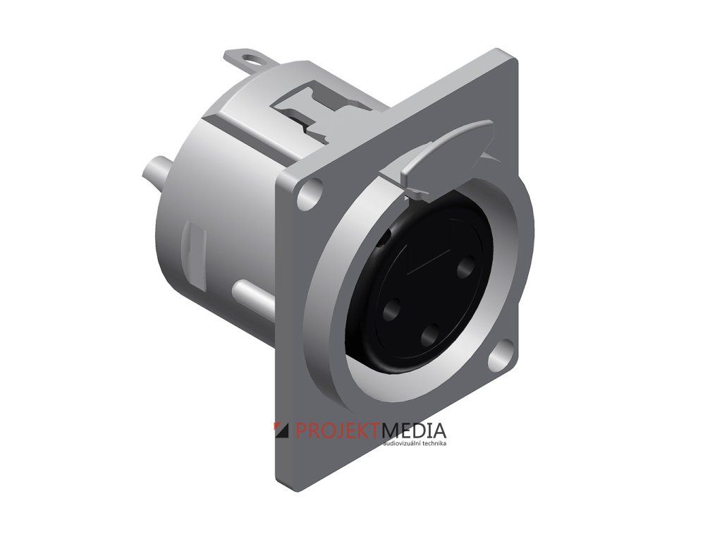 Panelový konektor XLR 3pin samice, kovový, D-size, pájecí kontakty. Kusový prodej.