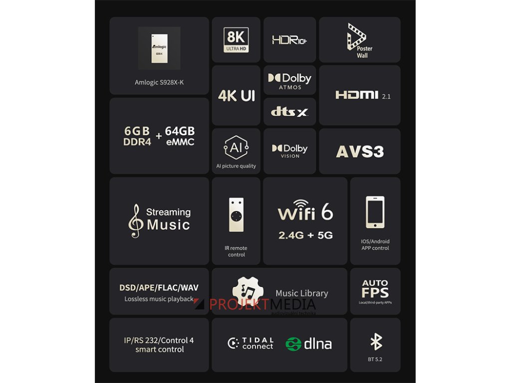 Podporuje video kodeky AV1/VP9/H.265/AVS3/AVS2, 12bit., široký rozsah barev BT.2020; Atmos/DTS X